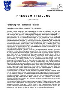 Förderung von Tischtennis-Talenten beim TTC Lechenich 20. November 2022 / Neuigkeiten / Von Peter Kaulen